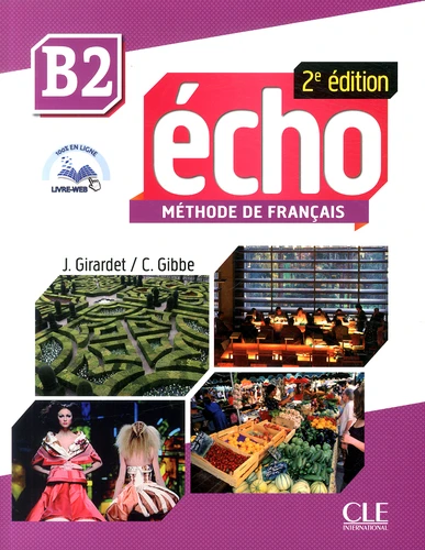 Livre de l'élève dans la collection écho , méthode de français langue étrangère (FLE) pour grands adolescents et adultes, niveau B2. écho , une méthode véritablement actionnelle et organisée par niveau du Cadre européen commun de référénce. écho c'est : une leçon 0 pour un démarrage en douceur (niveau A1) une grande souplesse d'utilisation pour l'enseignant une large place accordée à l'évaluation orale et écrite un DVD-Rom audio et vidéo (niveaux A1 et A2) ou un CD-mp3 (niveaux B1 et B2) inclus dans le livre de l'élève un cahier personnel d'apprentissage avec CD audio inclus un site compagnon https : //echo. cle-international. com/ Les nouveautés de la 2ème édition : une maquette rénovéedes illustrations et une iconographie actuelles des documents mis à jour et un livre-web, 100% en ligne, inclus dans le livre de l'élève et le cahier personnel d'apprentissage.