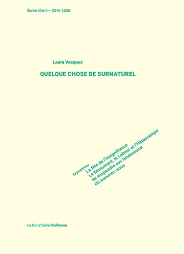 La poétesse et romancière Laura Vazquez est auteure associée à la saison d'exposition 2019/2020 de La Kunsthalle Mulhouse. Elle s'est immergée dans l'univers de quatre expositions, a composé librement autour des oeuvres et des idées qu'elle y a perçues. Publié suite aux expositions La fête de l'insignifiance, Le Monument, le Labeur et l'Hippocampe, Se suspendre aux lendemains et Où sommes-nous à la Kunsthalle Mulhouse en 2019-2020.