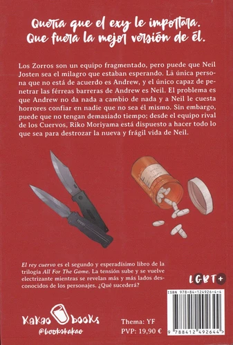 Los Zorros son un equipo fragmentado, pero puede que Neil Josten sea el milagro que estaban esperando. La única persona que no está de acuerdo es Andrew, y el único capaz de penetrar las férreas barreras de Andrew es Neil. El problema es que Andrew no da nada a cambio de nada y a Neil le cuesta horrores confiar en nadie que no sea él mismo. Sin embargo, puede que no tengan demasiado tiempo ; desde el equipo rival de los Cuervos, Riko Moriyama está dispuesto a hacer todo lo que sea para destrozar la nueva y frágil vida de Neil. El rey cuervo es el segundo y esperadisimo libro de la trilogía All For The Game. La tensión sube y se vuelve electrizante mientras se revelan más y más lados desconocidos de los personajes. ¿Qué sucederá?