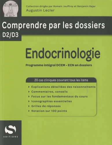 La médecine ne s'apprend pas que dans les livres, mais, de façon tout aussi importante, au lit du malade. Et comme le DCEM ne permet pas d'être externe dans toutes les spécialités, nous avons conçu la collection " comprendre par les dossiers ", comme un parfait complément du cours magistral, indispensable dès la D2, pour se familiariser avec les dossiers et préparer les certificats, jusqu'à la D4, pour se remettre les idées en place avant le concours. Le titre en résume la philosophie : permettre au lecteur de bien comprendre une spécialité, comme lors d'un stage hospitalier. Pour chaque item du programme des certificats et des ECN, un cas clinique classique (parfois plusieurs), aide à comprendre comment se présente le problème " dans la vraie vie ", en expliquant parfaitement toutes les notions abordées. Une iconographie typique, en version normale puis légendée, complète chaque fois que nécessaire les dossiers de l'ouvrage. Un index très détaillé permet de naviguer dans ce livre sans perte de temps. Le résultat escompté est une excellente mémorisation pour l'étudiant (car souvent on ne retient que ce qu'on a bien compris), et l'acquisition des bases de ce " bon sens " clinique qui permet d'effectuer une bonne démarche diagnostique et thérapeutique dans la spécialité traitée. Allez, en route maintenant, pour parfaitement comprendre l'endocrinologie par les dossiers !