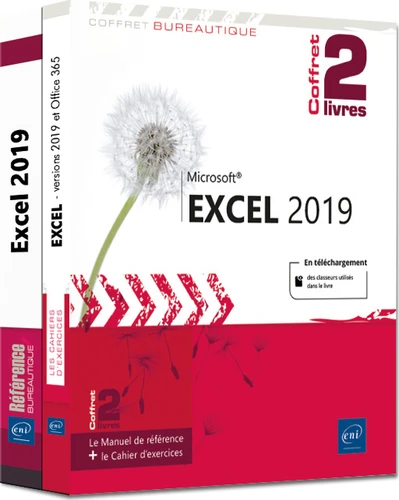 Ce coffret comprend 2 livres : le livre de référence (collection Référence Bureautique) et un cahier d'exercices pour s'entraîner. Excel - versions 2019 et Office 365 : Ce guide pratique vous présente dans le détail, les différentes fonctions du célèbre tableur Microsoft® Excel ; il a été rédigé avec la version 2019 d'Excel et intègre les nouveautés et différences de la version Excel livrée avec Office 365.