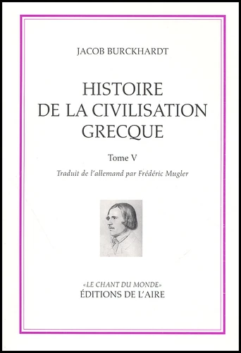 Historien des diversités, hostile à l'uniformité, Burckhardt est tout autant - on l'a vu à plusieurs reprises - l'historien de la continuité de notre civilisation. Continuité assurée par les soldats d'Alexandre avant les soldats romains. La Grèce vaincue par ceux-ci va conquérir spirituellement, culturellement ses vainqueurs. Les pas des légions avaient marché pour lui, dira Charles Péguy en parlant du Christ. Il s'agit aussi de la diffusion de l'héritage hellénique. L'hellénisation du monde passionne Burckhardt. Il l'exprime à diverses reprises aux dernières pages du dernier tome de l'Histoire de la civilisation grecque : Rome accueillit les formes, les couleurs, les senteurs grecques comme un complément longtemps désiré. Que le peuple romain, d'habitude si dur et sec et qui a aimé si peu de choses, ait ressenti ici un enthousiasme inhabituel est un véritable miracle. Ce tome supplémentaire comprend les notes des quatre premiers volumes ainsi qu'un résumé bio-bibliographique.