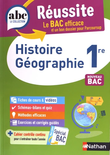 Des fiches de cours , des vidéos , des schémas-bilans et quiz , des méthodes efficaces , des exercices et corrigés guidés + un cahier spécial Bac contrôle continu pour réviser l'histoire-géographie en 1re ! - Enseignement commun - Conforme à la réforme du Lycée ABC Réussite - Histore-Géographie 1re - Bac 2026 Le BAC efficace et un bon dossier pour Parcoursup - Des fiches de cours pour réviser tout le programme.