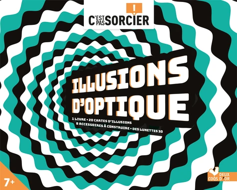 Un coffret-mallette avec une poignée contenant un livre rembordé de 32 pages sur le thème des illusions d'optique mêlant activités, expériences et informations documentaires. Accessoires : 20 cartes d'illusions d'optique, des lunettes avec filtre bleu et rouge pour voir en 3D et des planches en carte prédécoupées pour construire des objets en volume et expérimenter des illusions d'optique soi-même (un zootrope, un cube flottant, un thaumatrope, des toupies et un phénakistiscope).