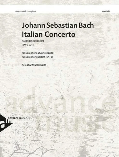 In this faithful adaptation of Bach's popular keyboard work in three distinct movements, all players serve in a variety of roles as soloist, as a small soloistic group within the ensemble (concertino), and as a tutti (ripieno) ensemble. For the sake of authenticity, all of Bach's original instructions, embellishments and articulations have been included and adjusted as necessary. Instrumentation : 4 saxophones (SATBar) BWV 971