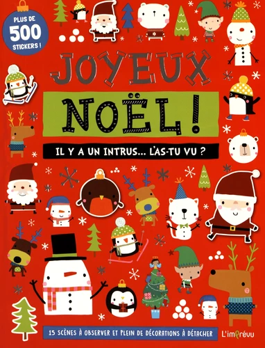 Sauras-tu retrouver le bonhomme de neige qui a perdu son nez, l'ange qui vole à l'envers, le petit renne qui s'est déguisé et le Père Noël qui porte un beau pull-over ? Observe bien les images et amuse-toi à chercher tous les intrus qui s'y cachent ! Découvre aussi plus de 500 stickers de Noël, des étiquettes pour tes cadeaux, des cartes de voeux et de jolies décorations à détacher !