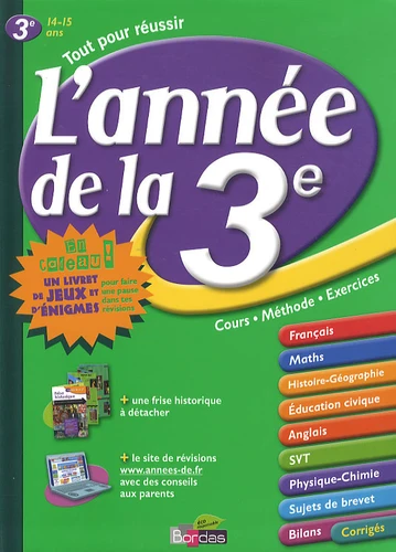 Toutes les matières du programme réunies dans le même livre. Un ouvrage indispensable pour être au niveau pendant l'année scolaire et réviser pendant les vacances. Chaque notion est développée en trois temps : l'essentiel du cours à mémoriser ; des méthodes et des exemples pour bien comprendre ; des exercices classés par ordre de difficulté pour s'entraîner, avec une autoévaluation ; et tous les corrigés à la fin du livre. Des sujets de brevet corrigés. Des bilans sous forme de QCM pour se tester. Une frise historique illustrée à détacher.