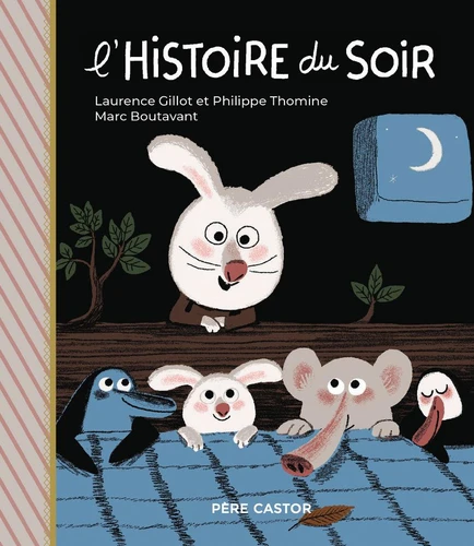 Martin Lapin raconte à ses enfants, l'histoire de... Florent Eléphant, qui raconte l'histoire de... Paolo Manchot, qui raconte l'histoire de... Eloi Dauphin, qui raconte l'histoire de... devinez qui ? Une ritournelle sur l'universalisme du rituel du coucher.