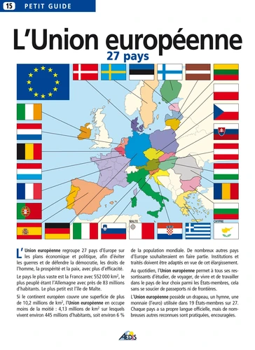 L'Union regroupe 27 pays d'Europe sur les plans économique et politique, afin d'éviter les guerres et de défendre la démocratie, les droits de l'homme, la prospérité et la paix, avec plus d'efficacité.