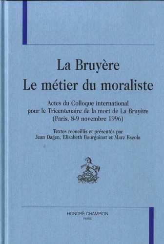 L'année 1696 vit à la fois la mort de l'auteur des Caractères et la parution de la neuvième et dernière édition de son oeuvre. Trois siècles de débats critiques nous séparent désormais de l'entreprise littéraire et morale de celui qui, pour la première fois dans le champ littéraire français, revendiqua l'écriture comme un métier : C'est un métier de faire un livre comme de faire une pendule... Pour son deuxième colloque, le Groupe d'Etude des Moralistes (UMR 8599 du CNRS - Université de Paris-Sorbonne) a souhaité que le tricentenaire de la mort de La Bruyère soit l'occasion de confronter au métier du moraliste les perspectives méthodologiques actuelles, mais aussi les attentes des lecteurs d'aujourd'hui.