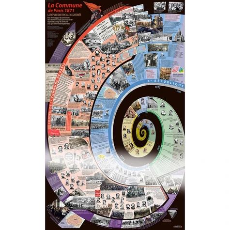 L'affiche plastifiée « La Commune de Paris 1871 » est une interprétation synoptique qui retrace les événements de la révolution sociale parisienne s'opposant au siège des allemands et au gouvernement d'Adolphe Thiers.