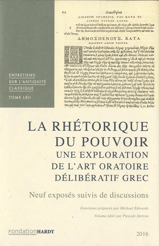 Le discours public joua un rôle important dans la vie des Grecs et des Romains tout au long de l'Antiquité. Les Entretiens 2015 avaient pour objectif l'examen des discours politiques grecs de l'époque classique (Ve-IVe siècles av. J.-C.) à la fin de l'Antiquité. Ce volume analyse les facettes d'une activité qui à plus d'un titre définit le monde grec antique. Les Entretiens ont été préparés par Michael Edwards, professeur de Classics à l'Université de Roehampton (Londres) et spécialiste des orateurs attiques.