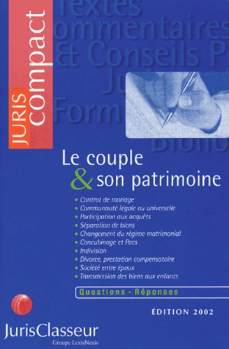 pratique. Les praticiens appelés à les conseiller auront entre les mains un instrument de consultation rapide et ils apprécieront les nombreuses références permettant d'aller plus loin dans la recherche. Voici quelques problèmes abordés dans l'ouvrage à l'intention des époux : le choix du régime matrimonial le mieux adapté, les clauses du contrat de mariage assurant la tranquillité de l'époux survivant, le changement de régime, les précautions à prendre lorsque l'on transmet des biens aux enfants, les problèmes de l'indivision, etc. Les couples non mariés ne sont pas oubliés. Les concubins sont soumis à davantage de devoirs qu'ils ne le pensent. Les partenaires d'un pacte civil de solidarité doivent connaître les conséquences de leur engagement et gérer leur patrimoine dans un contexte juridique assez délicat. Du fait au droit : Organisé par études thématiques, l'ouvrage aborde les sujets traités sous forme de questions-réponses. Partant du fait pour aller vers le droit, chaque étude présente : l'exposé des principales questions pratiques ; les réponses approfondies et argumentées (assorties notamment de conseils pratiques) ; les précisions jurisprudentielles ; les outils : formules et modèles, adresses utiles... ; le guide de recherche : textes applicables, références au Juris-classeur et bibliographie. Ces différentes rubriques permettent d'accéder directement à l'information recherchée.