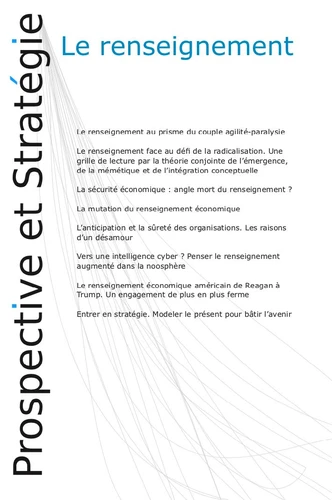Le renseignement, numéro 10 de la revue Prospective et Stratégie, coordonné par Nicolas Moinet. Le renseignement au prisme du couple agilité paralysie, Nicolas Moinet Le renseignement face au défi de la radicalisation, Franck Bulinge La sécurité économique : angle mort du renseignement, Olivier de Maison Rouge La mutation du renseignement économique, Christian Harbulot L'anticipation et la sûreté des organisation, Eric Delbecque Vers une intelligence cyber ? , Yannick Pech Le renseignement économique de Reagan à Trump, Ali Laïdi, Entrer en stratégie, Vincent Desportes, Nicolas Moinet.