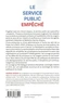 Fragilisé mais loin d'avoir disparu, le service public est aujourd'hui " empêché ". Plusieurs mécanismes entravent, gênent, font obstacle à sa conduite et produisent confusion et insatisfaction chez les usagers, perte du sens de leur mission et souffrance au travail pour les agents, sentiment d'abandon et fatalisme chez les citoyens. D'une entreprise ou d'une administration à l'autre (au sein de La Poste, de la SNCF, d'EDF, des hôpitaux, et d'autres services publics), les mêmes processus sont à l'oeuvre : la libéralisation européenne favorise la concurrence, la marchandisation et la financiarisation, fixent des objectifs de rentabilité, les privatisations bouleversent le statut des organisations qui produisent l'intérêt général. Cet ouvrage se penche sur les effets de ces processus sur les usagers comme sur les travailleurs. Même si leur principal effet d'entraîner une désingularisation du service public, il n'empêche que celui-ci continue, malgré tout, de fonctionner.