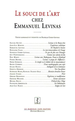 Le souci de l'art tel que Levinas nous invite précisément à le penser dans ses formes héritières du chaos, à peine pensables, à peine avouables, représente un moment décisif de la réflexion esthétique de la seconde moitié du XXe siècle. A la fois témoignage, philosophie critique et horizon de vérité qui viendraient comme dissimulés sous les oripeaux de l'intériorité. Les textes réunis dans ce volume tentent chacun une incursion dans une région de la pensée de Levinas qui ne se laisse pas réduire à des figures ou à une théorie critique. Nous avons tenu à ce que figurent des textes portant autant sur la littérature et la poésie que sur la peinture, voire la musique, tant deux de ces domaines - la littérature et la poésie - échappent pour Levinas au jugement sévère et à la méfiance éthique qu'il affiche dès lors qu'il est question d'art, comme objet qui s'érige en vrai sans le recours au verbe et à la parole.