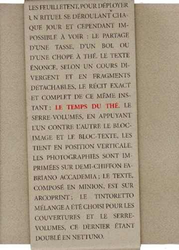 Les vues ne comportent ni légendes ni commentaires ni autre cadre que les mains qui les feuillettent, pour déployer un rituel se déroulant chaque jour et cependant impossible à voir : le partage d'une tasse, d'un bol ou d'une chope à thé. Le texte énonce, selon un cours divergent et en fragments détachables, le récit exact et complet de ce même instant : le temps du thé. Le serre-volumes, en appuyant l'un contre l'autre le bloc-image et le bloc-texte, les tient en position verticale. Les photographies sont imprimées sur demi-chiffon Fabriano Accademia ; le texte, composé en minion, est sur Arcoprint ; le tintoretto mélange a été choisi pour les couvertures et le serre-volumes, ce dernier étant doublé en nettuno.
