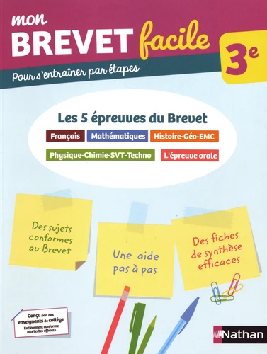 Mon Brevet facile - Les 5 épreuves du Brevet - 3e Français, Mathématiques, Histoire-Géographie-EMC, Physique-Chimie-SVT-Techno, l'épreuve orale. La méthode pas à pas pour réussir le Brevet ! 22 sujets complets pour réussir les épreuves écrites et orales - Des sujets conformes aux derniers programme pour se préparer aux épreuves du Brevet. Un concept progressif et efficace en 3 temps : - Chaque énoncé est expliqué pas à pas : comprendre le sujet, repérer les mots-clés...