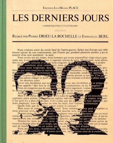 C'est en 1926 qu'Emmanuel Berl comprend que "tout est foutu" . Il crée alors, avec son ami Drieu la Rochelle un petit journal qui rend compte de cette angoisse devant "la misérable condition spirituelle de l'Europe" . Un "petit cahier d'observation résumée et d'ultime débat" , cahier politique et littéraire qui mène une importante réflexion sur la possible révolution communiste, le rôle de la bourgeoisie et du catholicisme.