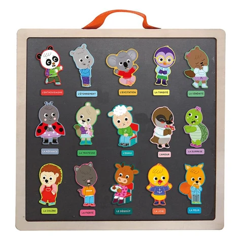 Sur ce tableau, 15 silhouettes aimantées représentent chacune une émotion. L'enfant pourra associer l'émotion au personnage, mais aussi dessiner ou écrire tout ce qui lui passe par la tête sur son tableau pour s'exprimer librement. L'ennui, la colère, la timidité, l'intérêt, la joie, la surprise, l'amour, la fierté, le dégoût, la sérénité, l'enthousiasme, la peur, l'excitation, la tristesse, la confiance.