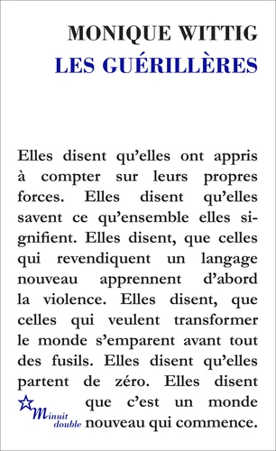 Publié cinq ans après L'Opoponax, Les Guérillères, second livre de Monique Wittig, vient à son heure pour souligner et fortifier notre conviction. Le talent de cet écrivain le porte, j'allais écrire, pour notre plaisir et notre profonde satisfaction, à faire du récit le lieu naturel de la contestation du langage, non pas contestation abrupte et maladroite, mais contestation habile par le biais d'une opération beaucoup plus subtile et toujours séduisante.