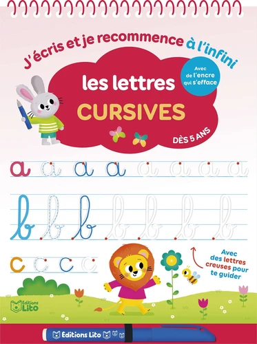 Grâce au crayon magique et aux lignes creuses, l'enfant s'entraîne à écrire de belles lettres cursives, puis des mots, en se laissant guider. Une activité à refaire à l'infini car l'encre s'efface toute seule au bout de 20 minutes !