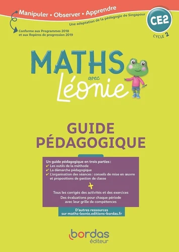 Le guide pédagogique Les Maths avec Léonie CE2 est découpé en trois parties : La présentation de la démarche Les Maths avec Léonie CE2 - Pédagogie de Singapour La présentation des outils Le déroulé de chaque leçon du CE2 avec des conseils didactiques et le corrigé des exercices. Vos ressources pédagogiques Les Maths avec Léonie CE2 offertes : Sur le site Les Maths avec Léonie , vous pouvez télécharger gratuitement les ressources pédagogiques suivantes : Une Fiche d'entraînement en autonomie associée à chaque leçon Les traces écrites J'apprends de chaque leçon à imprimer pour distribuer ou afficher Des évaluations pour chaque période et leur grille de compétences Les cartes des jeux à imprimer et plastifier Les jeux à faire à la maison Le guide pédagogique Les cahiers en version numérique pour l'enseignant La pédagogie Singapour, qu'est-ce que c'est ? La pédagogie de Singapour est une méthode explicite qui repose sur 6 temps d'apprentissage : La manipulation L'observation La modélisation mathématique L'entrainement et la répétition L'utilisation des jeux mathématiques La résolution de problèmes C'est une méthode de mathématique progressive, qui favorise la collaboration ! L'élève apprend en étant actif : en manipulant des cubes, des jetons et des objets, il approche les notions de façon concrète ; son intérêt et sa créativité sont stimulés.