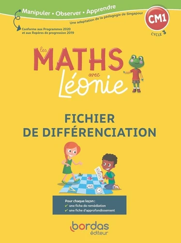 Les principes pédagogiques des Maths avec Léonie CM1 #Manipuler, observer, apprendre ! - L'élève apprend en étant actif : en manipulant des cartes, des jetons et des objets, il approche les notions de façon concrète ; son intérêt et sa créativité sont stimulés. - L'élève apprend en échangeant avec ses pairs : en verbalisant sa stratégie, il s'habitue à mettre des mots sur des concepts et à comparer son raisonnement à celui des autres, notamment dans la rubrique Je cherche avec mes copains. - L'élève apprend en s'entraînant : les nombreux exercices, très progressifs, permettent à l'élève d'appliquer les notions apprises. - L'élève apprend en s'amusant : par des activités en groupe, des jeux mathématiques, des énigmes et des prolongements hors de la classe en famille, il aborde les mathématiques avec plaisir, ce qui l'aide à dépasser les obstacles et à développer sa confiance en lui. - L'élève apprend en cherchant : dans la rubrique Le petit détective, les élèves sont invités à raisonner, à réfléchir de façon autonome et non à appliquer des automatismes. La structure du fichier de différenciation Les Maths avec Léonie CM1 Pour chaque leçon, deux types de fiches d'exercices pour la différenciation : - des fiches de remédiation pour les élèves en difficulté avec la notion étudiée - des fiches d'approfondissement pour ceux qui ont envie d'aller plus loin. Toutes ces fiches sont photocopiables pour une classe. Les compléments pédagogiques offerts #Sur le site ressources à télécharger gratuitement : - Le guide pédagogique - Une fiche d'entraînement en autonomie associée à chaque leçon - Les supports des jeux et des manipulations à imprimer - Les traces écrites J'apprends de chaque leçon à imprimer pour distribuer ou afficher - Des évaluations pour chaque période et leur grille de compétences A télécharger sur https : //maths-leonie. editions-bordas. fr/ #Le cahier numérique enseignant gratuit pour les enseignants dont les élèves sont dotés des cahiers papiers Les cahiers de l'élève 1 et 2 optimisés pour la vidéoprojection et enrichis de ressources : un guide pédagogique, les corrigés des exercices et des diaporamas de calcul mental. #Un groupe facebook Les Maths avec Léonie Pour échanger avec vos collègues, partager votre expérience et vos astuces, questionner nos auteurs pour utiliser pleinement votre méthode, découvrir en avant-première les futurs titres...