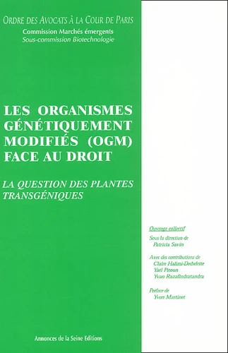 " Les Organismes Génétiquement Modifiés (OGM) face au Droit - La question des plantes transgéniques " est un ouvrage collectif de synthèse et de prospective, autant que de vulgarisation scientifique et juridique. S'y trouvent exposées quelques-unes des grandes interrogations scientifiques en cours sur les effets dénoncés des plantes transgéniques sur les règnes végétal, animal et humain. Une fois posée la problématique en termes d'identification des risques, les auteurs exposent le cadre juridique du droit des OGM (droit national et communautaire), ainsi que la portée du principe de précaution dans ce débat, sans omettre de décrire la possible responsabilité des différents intervenants en matière civile, pénale et administrative. A ce titre, cet ouvrage constitue un outil de synthèse et de réflexion multidisciplinaires. Il est destiné à un large public de juristes, scientifiques et citoyens concernés par la question des plantes transgéniques.