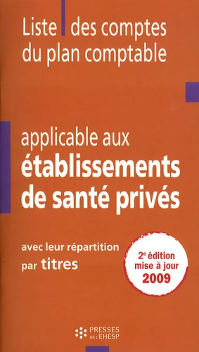 Liste des comptes du plan comptable applicable aux établissements de santé privés (mentionnés aux b et c de l'article L.162-22-6 du code de la sécurité sociale) avec leur répartition par titres Arrêté du 24 décembre 2008 : Nomenclature budgétaire et comptable applicable aux établissements de santé privés mentionnés aux b et c de l'article L.162-22-6 du code de la sécurité sociale ; Nomenclature budgétaire et comptable applicable à l'activité des unités de soins de longue durée ; Composition des titres du tableau de financement prévisionnel ; Composition des titres du compte de résultat prévisionnel principal ; Composition des titres du compte de résultat prévisionnel de l'activité des unités de soins de longue durée.