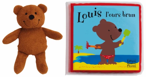 Louis l'ours brun. Livre de bain rempli d'air et personnage en éponge