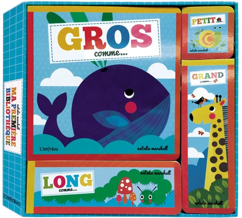 GRAND comme une girafe, PETIT comme un escargot, LONG comme une chenille, GROS comme une baleine... Parfaitement adaptés aux petites mains, ces quatre adorables imagiers feront le bonheur des tout-petits. Ils y découvriront de nouveaux mots et apprendront à différencier les tailles dans l'univers joyeux et coloré de Natalie Marshall !