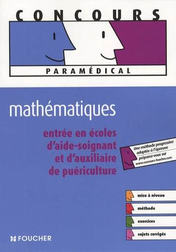 Vous passez le concours d'entrée en écoles d'aide-soignant ou d'auxiliaire de puériculture qui comporte une épreuve de mathématiques. Préparez cette épreuve, elle fait al différence. Pour réussir l'épreuve écrite comportant des mathématiques, vous devez : connaître les opérations, savoir convertir. Mettez toutes les chances de votre côté grâce à cet ouvrage. Mettez-vous à niveau en révisant les règles de base du calcul. Vérifiez vos acquis pour effectuer des opérations revoyez les règles sur la proportionnalité, les fractions, les unités de mesure. Entraînez-vous avec des exercices d'application et des sujets corrigés.
