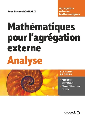 Tout le programme d'analyse, spécifique au concours de l'agrégation externe de mathématiques. La préparation des candidats aux concours de recrutement de l'Education nationale réclame des outils et des méthodes qu'il leur est souvent bien difficile de se procurer, faute d'une littérature adaptée aux exigences de la situation. Taillé sur mesure pour ceux de l'agrégation externe de mathématiques, ce cours intègre, principalement, les notions du programme d'analyse spécifique à ce concours : Théorie de la mesure et intégrale de Lebesgue, calcul différentiel dans les espaces de Banach, espaces de Hilbert et fonctions holomorphes, applications. Toutes les notions y sont abordées dans le détail et leur assimilation est facilitée par plus de 200 exercices corrigés dont beaucoup peuvent être utilisés par les candidats pour leur leçon à l'épreuve orale. Ce manuel sera également très utile aux étudiants en L3 et M1 de mathématiques. Il est complété par Mathématiques pour l'agrégation externe. Probabilités, rédigé par Walter Appel et publié dans la même collection. Sommaire : 1. Théorie de la mesure - 2. Fonctions mesurables et intégrables - 3. Intégration sur un espace produit - 4. Espaces Lp - 5. Espaces de Hilbert - 6. Fonctions presque périodiques - 7. Fonctions différentiables - 8. Différentielles d'ordre supérieur - 9. Inversion locale, fonctions implicites - 10. Fonctions holomorphes - 11. Fonctions analytiques - 12. Suites de fonctions holomorphes - 13. Homotopie - 14. Fonctions méromorphes - 15. Transformation de Laplace - 16. Fonctions usuelles et spéciales - Références - Index