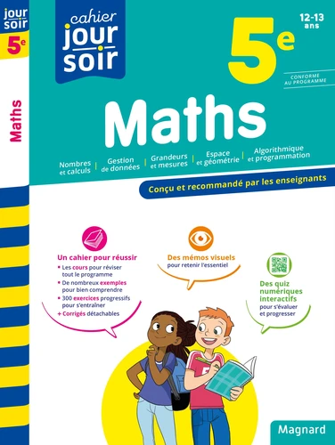 Le cahier le plus complet pour faire le lien entre le collège et la maison en maths - Tout le programme de 5e pour comprendre et s'entraîner - Nombres et calculs / Gestion de données / Grandeurs et mesures / Géométrie / Algorithmique et programmation - Une structure claire et efficace pour couvrir toutes les notions du programme - Les règles à retenir et de nombreux exemples -300 exercices progressifs pour vérifier l'acquisition des connaissances et les mettre en pratique - Des astuces et des conseils pour tout maîtriser - Tous les corrigés détachables au centre du cahier - Des mémos visuels pour maîtriser l'essentiel sous forme de schémas et cartes mentales : critères de divisibilité ; symétrie centrale, construction du symétrique ; gestion de données ; proportionnalité ; triangles ; fraction - Des compléments numériques gratuits : des quiz interactifs