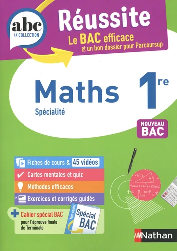 Des fiches de cours , 45 vidéos , des cartes mentales et quiz , des méthodes efficaces , des exercices et corrigés guidés + un cahier spécial Bac pour réviser les mathématiques en 1re ! - Enseignement de spécialité - Conforme à la réforme du Lycée ABC Réussite - Maths 1re - Bac 2026 Le BAC efficace et un bon dossier pour Parcoursup - Des fiches de cours pour réviser tout le programme. - Des pages révisions express avec des cartes mentales pour retenir en un coup d'oeil.