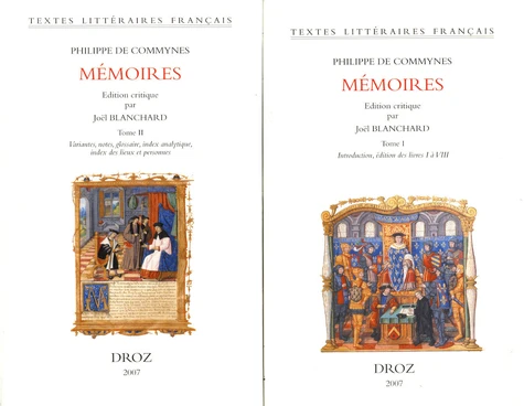 La présente publication est la première édition véritablement critique des Méritoires de Philippe de Commynes. Elle comporte l'ensemble des variantes, quelque douze mille. Réalisée à partir des recherches les plus complètes sur les manuscrits et sur la réception éditoriale extraordinairement riche des Méritoires, elle fournit un instrument de travail entièrement inédit et un progrès considérable par rapport aux anciennes éditions (E. Dupont, 1840 ; B. de Mandrot, 1903 ; J. Calmette, 1924). Elle permet également de renouer avec une tradition scientifique rigoureuse, dans laquelle Commynes et son œuvre retrouvent toute leur place, leur diversité et leurs reflets contrastés. Diplomate, homme de procès, homme d'argent, armateur, confident des grands de son temps, écrivain, Commynes nous révèle la trame multiple de ses activités et réseaux européens. Augmentée d'un index analytique de 160 pages, d'un index des lieux et personnes de plus de 200 pages, de notes abondantes établies à partir de recherches récentes et parfois inédites, l'édition de Joël Blanchard répond aux attentes des chercheurs et leur fournit un outil de travail indispensable. Elle constitue par ailleurs la pièce maîtresse de l'édition en cours à Genève du "corpus" commynien par Joël Blanchard, avec les lettres déjà publiées, et les "Pièces originales" à paraître (deux volumes).