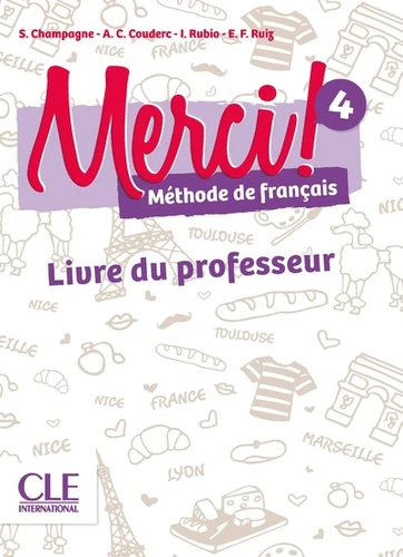 Guide pédagogique dans la collection Merci ! , méthode de français langue étrangère (FLE) pour adolescents, niveau 4 (A2) Merci ! communication et action pour le plaisir d'apprendre des situations de communication proches de la réalité des élèves des activités d'oral en interaction de nombreuses activités ludiques des chansons pour tous les goûts des pages de civilisation centrées sur les intérêts des jeunes adolescents vidéo : des fictions et des reportages un lexique illustré Merci ! un vrai projet global à chaque niveau, son projet un projet divisé en tâches : une tâche par unité jusqu'au projet final une véritable approche actionnelle Merci ! une sensibilisation à l'interculturel La méthode présente une ouverture à toutes les cultures francophones, de Marseille à Dakar, de Bruxelles aux Antilles... Merci ! une méthode adaptée aux conditions réelles d'enseignement les unités sont organisées par séances de cours les 6 unités correspondent à 50 à 70 séances selon les contextes le niveau A2 du CECR est atteint à la fin du niveau 4 des entrainements préparent au DELF junior A1 et A2 une attention spécifique est portée à la lecture et à la grammaire Merci ! le matériel Pour l'élève livre de l'élève avec DVD-Rom multimédia cahier d'exercices Pour le professeur guide pédagogique ressource pour une pédagogie différenciée en fonction des niveaux fichier d'évaluations photocopiables épreuves blanches de DELF junior A1 et A2 portfolio : pour chaque niveau CD audio pour la classe posters pour la classe version numérique pour TBI et vidéo-projection
