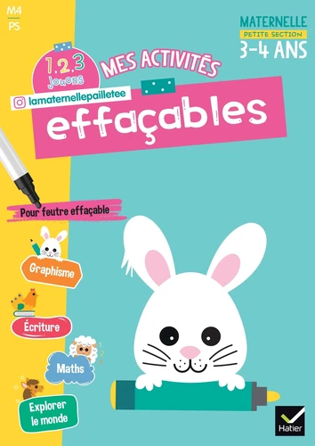 Cet ouvrage de Petite section est conçu par une professeure des écoles, Alissia Waeles, active sur les réseaux sociaux et connue sous le pseudonyme La Maternelle pailletée, @lamaternellepailletee. Les activités proposées sont ludiques et richement illustrées. Elles permettent à votre enfant de s'entrainer dans tous les domaines d'apprentissage de l'école maternelle : maths, graphisme, écriture et explorer le monde. Ce cahier s'utilise avec un feutre effaçable pour que votre enfant puisse se tromper, effacer, recommencer et prendre confiance en lui.