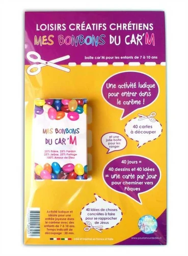 Une proposition originale pour entrer dans le carême et pour parcourir les 40 jours jusqu'à Pâques : Mes Bonbons du Car'M, ce sont 40 cartes à découper, illustrées avec humour à partir des lettres de St Paul, avec au verso une parole, comme un bonbon, à savourer à un moment de la journée. Loisir créatif présenté sous cellophane, au format 18x30cm. Contenu : belle boîte de bonbons au format : 6x9cm, une grande planche de cartes à couper.
