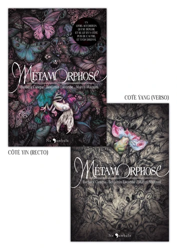 SOUS LA FORME D'UN LEPORELLO, BARBARA CANEPA, BENJAMIN LACOMBE ET MARCO MAZZONI CELEBRENT LE CYCLE DE LA VIE ET DE LA MORT A TRAVERS UNE VISION FANTASMAGORIQUE DE LA NATURE. Véritable célébration de la faune et de la flore, "La Métamorphose" déploie sous la forme d'un leporello qui se lit d'un côté, puis de l'autre, telle une boucle infinie, le cycle fascinant de la vie et de la mort. De petits têtards grouillent sous l'eau, se transforment en grenouilles virevoltant sur fond de nature fantasmagorique, avant de s'éteindre et de donner naissance à une vie nouvelle dont les racines émergent d'une terre nourricière. Porté par les textes de Barbara Canepa (au recto) et Benjamin Lacombe (au verso), le travail de Marco Mazzoni sublime la beauté de la nature en révélant un art du raffinement allégorique.
