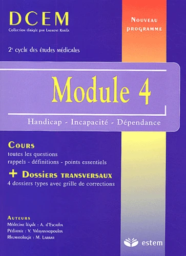 Le nouveau programme du DCEM, avec un découpage et une organisation des connaissances par modules thématiques, replace les patients et leurs pathologies dans un cadre transversal naturel, permettant au futur médecin d'améliorer leur prise en charge immédiate et à long terme. Cette nouvelle collection traite l'intégralité des items du programme modulaire du DCEM. Pour chaque ouvrage, le directeur de collection, Laurent Karila, a fait appel à des auteurs de spécialités différentes qui ont pris soin de faire ressortir l'incontournable trame qui permettra à l'étudiant de réussir ses modules transdisciplinaires. Les chapitres, rédigés de façon claire et synthétique, enrichis de nombreux tableaux, encadrés et illustrations, facilitent la mémorisation de l'essentiel.