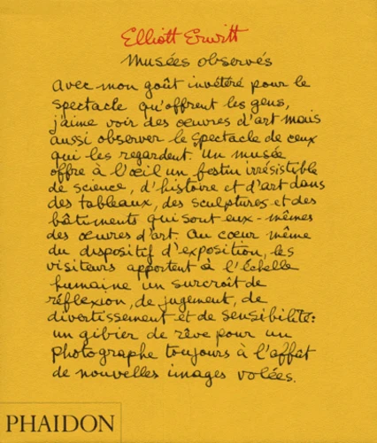 " Photographe par profession et amateur invétéré par passion ", le célèbre Elliott Erwitt accorde une place de choix à ses instantanés personnels. Lorsqu'il est désœuvré à New York ou a du temps libre au cours de ses fréquents déplacements, Erwitt flâne dans les musées et les expositions, réfléchit sur l'art, regarde les visiteurs et prend des photos.