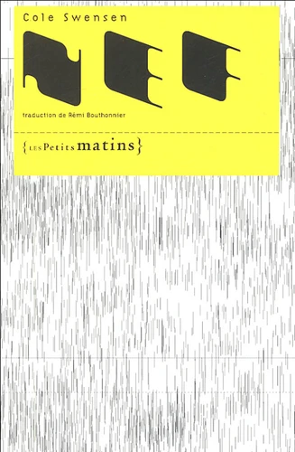Cole Swensen est l'auteur d'une dizaine de livres salués par les plus grands poètes américains (Michael Palmer, Keith Waldrop). Elle traduit du français, notamment Pierre Alferi, Olivier Cadiot, Jean Frémon, Michel Le,ris, Pascalle Monnier La traduction est de Rémi Bouthonnier, lui aussi poète.