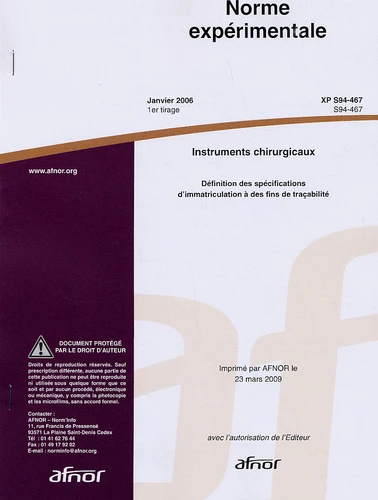 Norme expérimentale XP S94 - 467 Instruments chirurgicaux. Définition des spécifications d'immatriculation à des fins de traçabilité