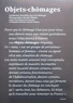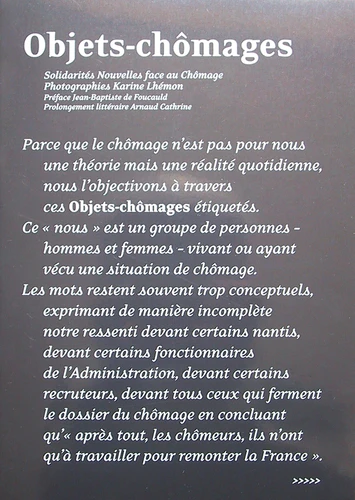 Parce que le chômage n'est pas pour nous une théorie mais une réalité quotidienne, nous l'objectivons à travers ces Objets-chômages étiquetés. Ce " nous " est un groupe de personnes -hommes et femmes -vivant ou ayant vécu une situation de chômage. Les mots restent souvent trop conceptuels, exprimant de manière incomplète notre ressenti devant certains nantis, devant certains fonctionnaires de l'Administration, devant certains recruteurs, devant tous ceux qui ferment le dossier du chômage en concluant qu' " après tout les chômeurs, ils n'ont qu'à travailler pour remonter la France ".