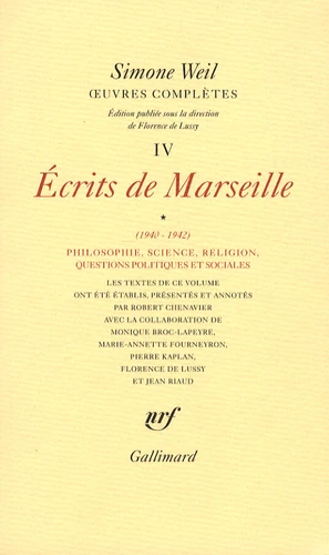 Premier volume du tome IV des Ouvres complètes, regroupant les "Ecrits de Marseille", de 1940 à 1942, traitant de philosophie, science, religion et de questions politiques et sociales.
