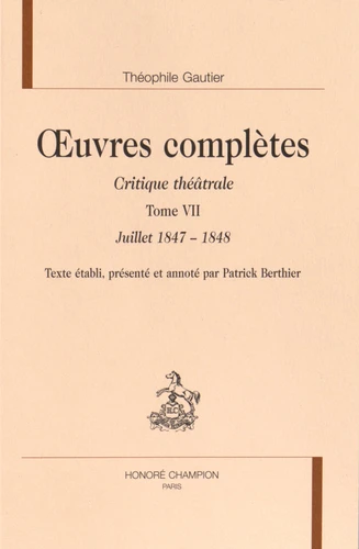 L'édition du feuilleton théâtral de Théophile Gautier parvient à son septième volume, qui couvre la période allant de juillet 1847 à la fin de 1848. Les goûts du critique persistent : attirance pour l'opéra, rejet de la tragédie à l'ancienne, lassitude face au vaudeville répétitif, célébration des genres "oculaires" (ballet, pantomime, cirque). S'ajoute ici la circonstance (révolution de février, journées de juin), qui trouble durablement l'activité des théâtres.