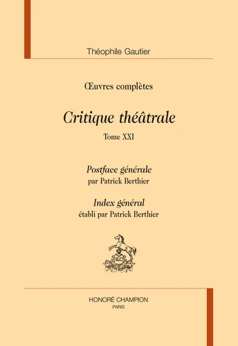 Ce dernier volume de la première édition scientifique de la Critique théâtrale de Gautier revêt un caractère particulier. Il s'ouvre sur une postface générale d'où se dégage le portrait le plus complet possible du feuilletoniste en action. Viennent ensuite des addenda qui signalent des lacunes dans l'annotation, et un choix d'errata corrigeant, d'une part, des erreurs de saisie si elles compromettent la compréhension du texte, et indiquant, d'autre part, des notes à rectifier.