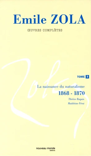 Ce volume contient Thérèse Raquin, écrit et publié à l'extrême fin de 1867, Madeleine Férat, publié en 1868 ainsi qu'un choix d'articles. On trouvera La Fortune des Bougon, dont 1a publication en feuilleton a été arrêtée par la guerre, dans le volume suivant.